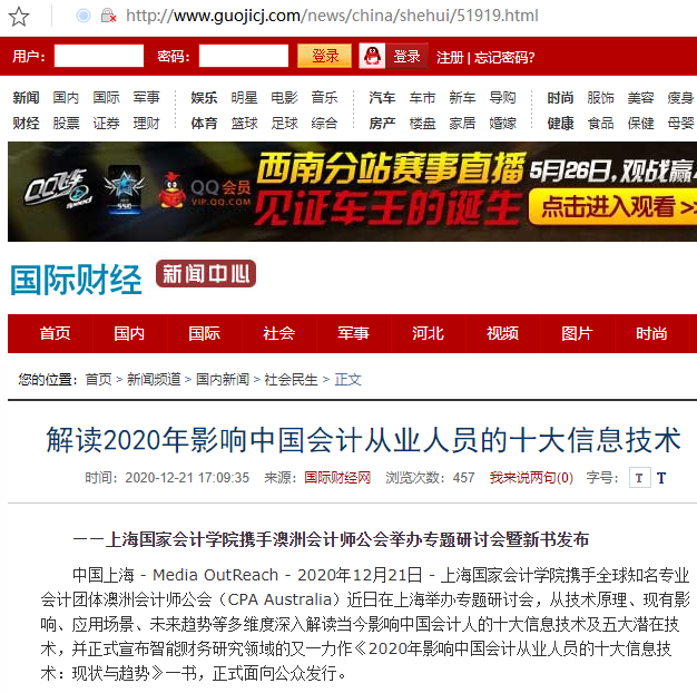 中国上海 - Media OutReach - 2020年12月21日 - 上海国家会计学院携手全球知名专业会计团体澳洲会计师公会(CPA Australia)近日在上海举办专题研讨会,从技术原理、现有影响、应用场景、未来趋势等多维度深入解读当今影响中国会计人的十大信息技术及五大潜在技术,并正式宣布智能财务研究领域的又一力作《2020年影响中国会计从业人员的十大信息技术:现状与趋势》一书,正式面向公众发行。