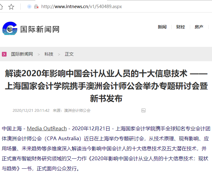 解读2020年影响中国会计从业人员的十大信息技术 ——上海国家会计学院携手澳洲会计师公会举办专题研讨会暨新书发布【2020年12月21日,国际新闻网】