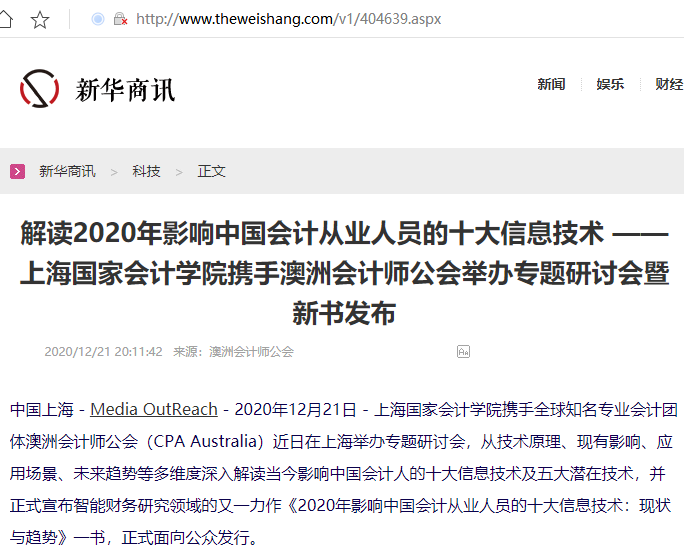 解读2020年影响中国会计从业人员的十大信息技术 ——上海国家会计学院携手澳洲会计师公会举办专题研讨会暨新书发布【2020年12月21日,新华商讯】