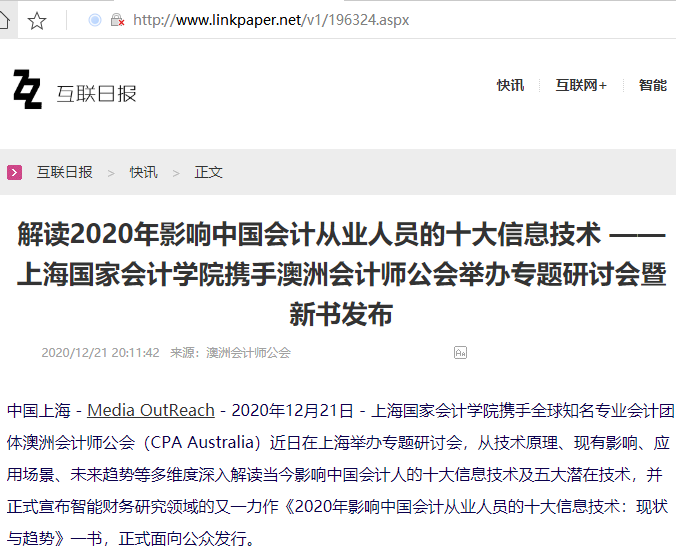 解读2020年影响中国会计从业人员的十大信息技术 ——上海国家会计学院携手澳洲会计师公会举办专题研讨会暨新书发布【2020年12月21日,互联日报】