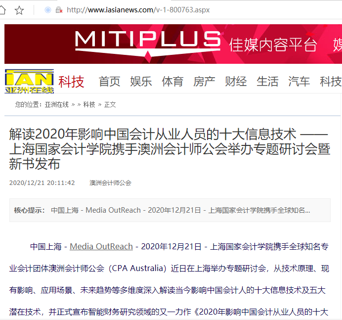 解读2020年影响中国会计从业人员的十大信息技术 ——上海国家会计学院携手澳洲会计师公会举办专题研讨会暨新书发布【2020年12月21日,亚洲在线】