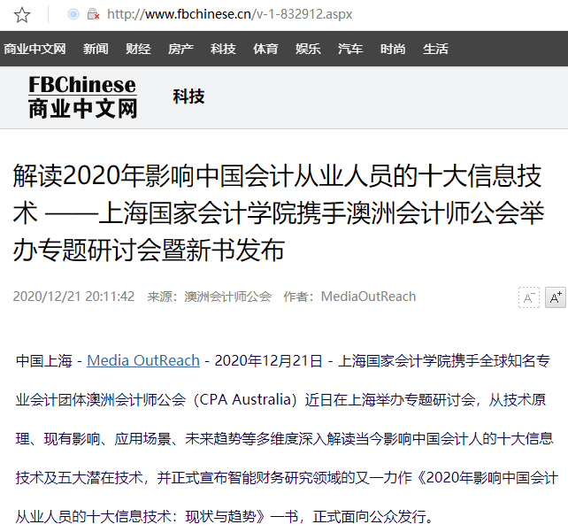 解读2020年影响中国会计从业人员的十大信息技术 ——上海国家会计学院携手澳洲会计师公会举办专题研讨会暨新书发布【2020年12月21日,商业中文网】