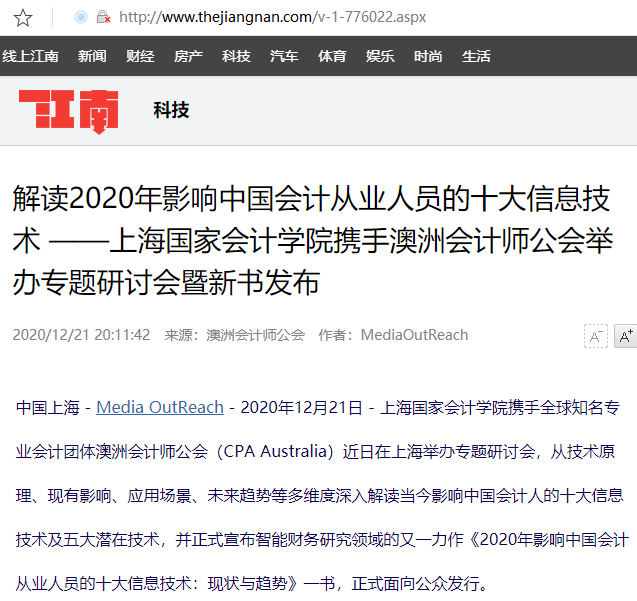解读2020年影响中国会计从业人员的十大信息技术 ——上海国家会计学院携手澳洲会计师公会举办专题研讨会暨新书发布【2020年12月21日,江南在线】