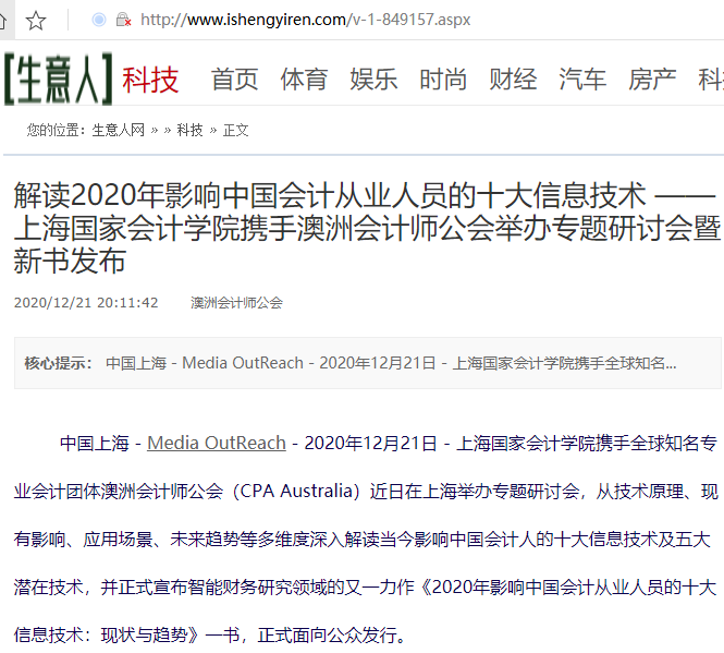 解读2020年影响中国会计从业人员的十大信息技术 ——上海国家会计学院携手澳洲会计师公会举办专题研讨会暨新书发布【2020年12月21日,生意人】