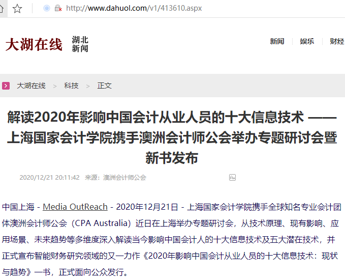 解读2020年影响中国会计从业人员的十大信息技术 ——上海国家会计学院携手澳洲会计师公会举办专题研讨会暨新书发布【2020年12月21日,大湖在线】