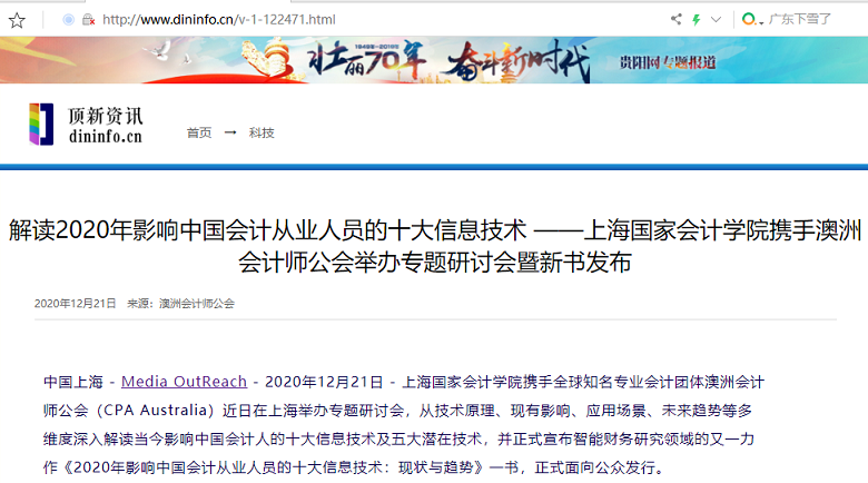 解读2020年影响中国会计从业人员的十大信息技术 ——上海国家会计学院携手澳洲会计师公会举办专题研讨会暨新书发布【2020年12月21日,顶新资讯】