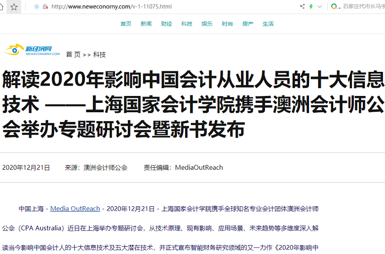 解读2020年影响中国会计从业人员的十大信息技术 ——上海国家会计学院携手澳洲会计师公会举办专题研讨会暨新书发布【2020年12月21日,新经济网】