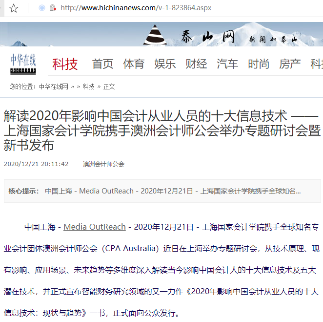解读2020年影响中国会计从业人员的十大信息技术 ——上海国家会计学院携手澳洲会计师公会举办专题研讨会暨新书发布【2020年12月21日,中华在线】