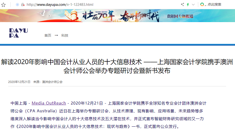 解读2020年影响中国会计从业人员的十大信息技术 ——上海国家会计学院携手澳洲会计师公会举办专题研讨会暨新书发布【2020年12月21日,大渝在线】