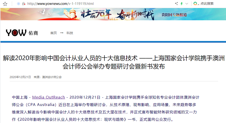 解读2020年影响中国会计从业人员的十大信息技术 ——上海国家会计学院携手澳洲会计师公会举办专题研讨会暨新书发布【2020年12月21日,佑商网】