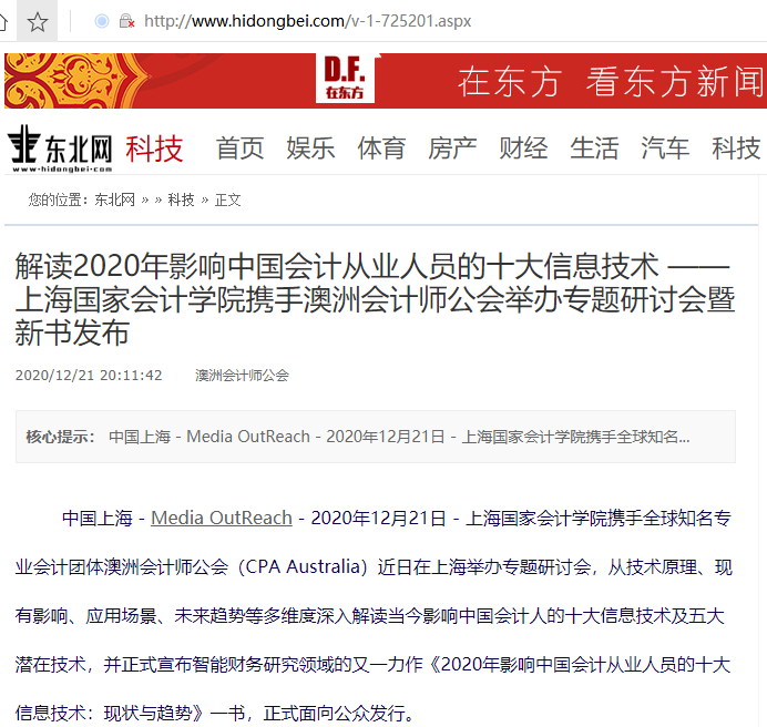 解读2020年影响中国会计从业人员的十大信息技术 ——上海国家会计学院携手澳洲会计师公会举办专题研讨会暨新书发布【2020年12月21日,东北网】