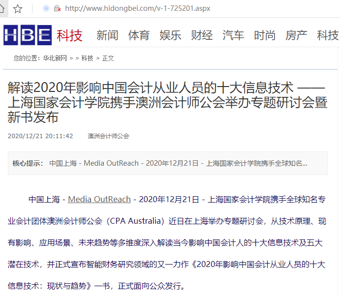 解读2020年影响中国会计从业人员的十大信息技术 ——上海国家会计学院携手澳洲会计师公会举办专题研讨会暨新书发布【2020年12月21日,华北新闻】