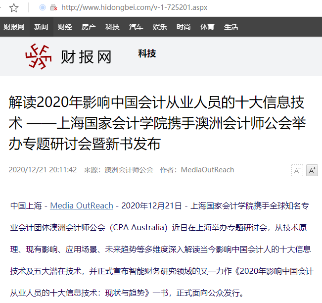 解读2020年影响中国会计从业人员的十大信息技术 ——上海国家会计学院携手澳洲会计师公会举办专题研讨会暨新书发布【2020年12月21日,财报网】