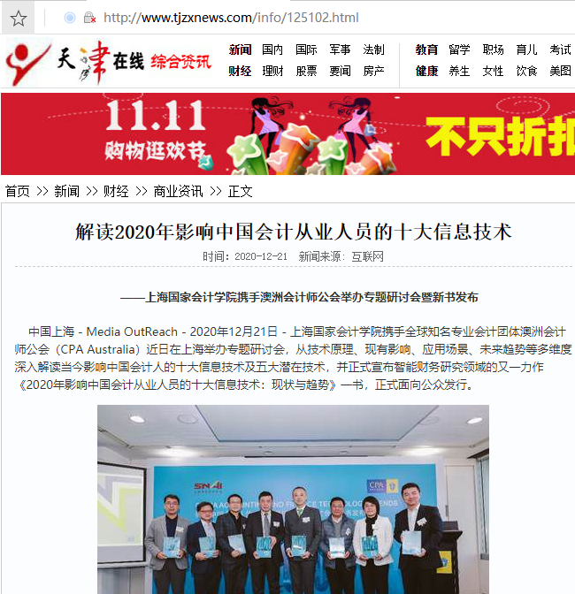 中国上海 - Media OutReach - 2020年12月21日 - 上海国家会计学院携手全球知名专业会计团体澳洲会计师公会(CPA Australia)近日在上海举办专题研讨会,从技术原理、现有影响、应用场景、未来趋势等多维度深入解读当今影响中国会计人的十大信息技术及五大潜在技术,并正式宣布智能财务研究领域的又一力作《2020年影响中国会计从业人员的十大信息技术:现状与趋势》一书,正式面向公众发行。