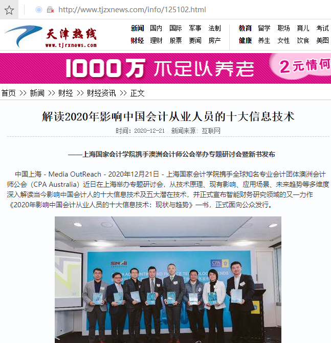 中国上海 - Media OutReach - 2020年12月21日 - 上海国家会计学院携手全球知名专业会计团体澳洲会计师公会(CPA Australia)近日在上海举办专题研讨会,从技术原理、现有影响、应用场景、未来趋势等多维度深入解读当今影响中国会计人的十大信息技术及五大潜在技术,并正式宣布智能财务研究领域的又一力作《2020年影响中国会计从业人员的十大信息技术:现状与趋势》一书,正式面向公众发行。