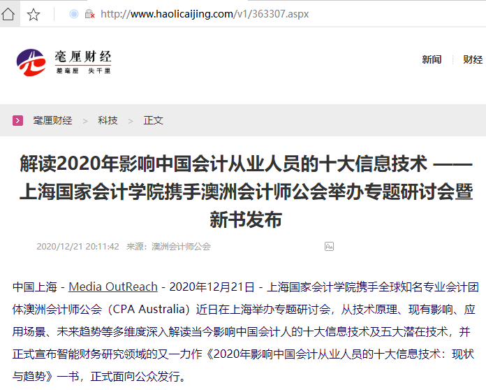 解读2020年影响中国会计从业人员的十大信息技术 ——上海国家会计学院携手澳洲会计师公会举办专题研讨会暨新书发布【2020年12月21日,毫厘财经】