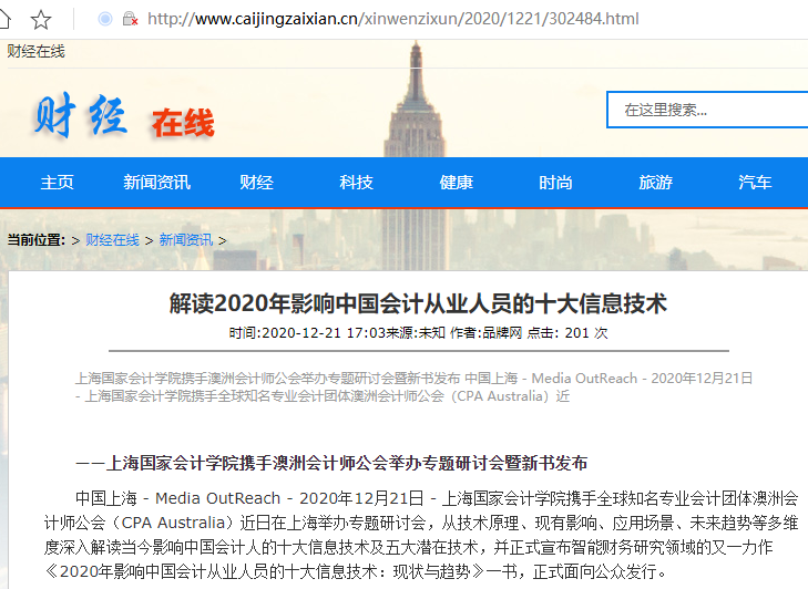 中国上海 - Media OutReach - 2020年12月21日 - 上海国家会计学院携手全球知名专业会计团体澳洲会计师公会(CPA Australia)近日在上海举办专题研讨会,从技术原理、现有影响、应用场景、未来趋势等多维度深入解读当今影响中国会计人的十大信息技术及五大潜在技术,并正式宣布智能财务研究领域的又一力作《2020年影响中国会计从业人员的十大信息技术:现状与趋势》一书,正式面向公众发行。