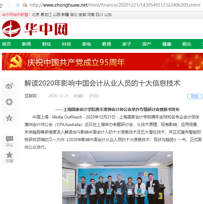 中国上海 - Media OutReach - 2020年12月21日 - 上海国家会计学院携手全球知名专业会计团体澳洲会计师公会(CPA Australia)近日在上海举办专题研讨会,从技术原理、现有影响、应用场景、未来趋势等多维度深入解读当今影响中国会计人的十大信息技术及五大潜在技术,并正式宣布智能财务研究领域的又一力作《2020年影响中国会计从业人员的十大信息技术:现状与趋势》一书,正式面向公众发行。