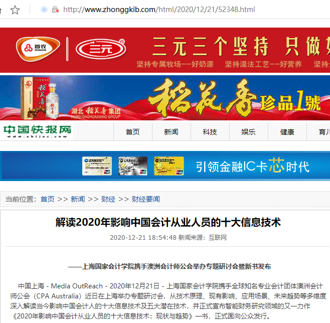中国上海 - Media OutReach - 2020年12月21日 - 上海国家会计学院携手全球知名专业会计团体澳洲会计师公会(CPA Australia)近日在上海举办专题研讨会,从技术原理、现有影响、应用场景、未来趋势等多维度深入解读当今影响中国会计人的十大信息技术及五大潜在技术,并正式宣布智能财务研究领域的又一力作《2020年影响中国会计从业人员的十大信息技术:现状与趋势》一书,正式面向公众发行。