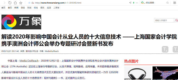解读2020年影响中国会计从业人员的十大信息技术 ——上海国家会计学院携手澳洲会计师公会举办专题研讨会暨新书发布【2020年12月21日,万象资讯网】