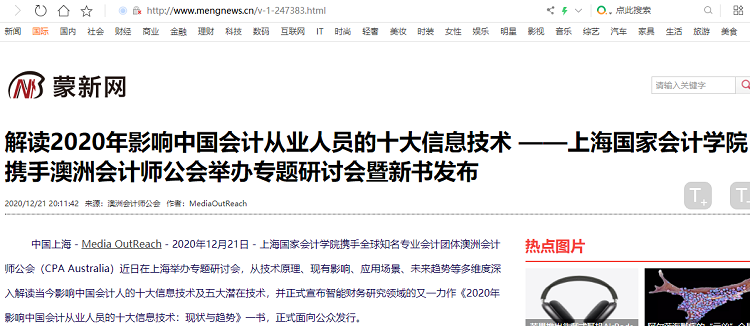 解读2020年影响中国会计从业人员的十大信息技术 ——上海国家会计学院携手澳洲会计师公会举办专题研讨会暨新书发布【2020年12月21日,蒙新网】