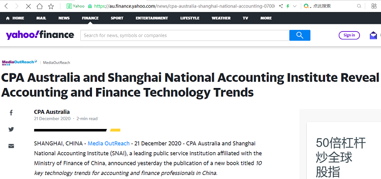 CPA Australia and Shanghai National Accounting Institute Reveal Accounting and Finance Technology Trends【2020年12月21日,Yahoo Finance Australia】