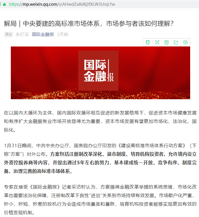 1月31日晚间,中共中央办公厅、国务院办公厅印发的《建设高标准市场体系行动方案》(下称“方案”)对外公布。方案包括注册制改革深化、退市制度、培育机构投资者、允许境内设立外资控股券商等内容,并提出通过5年左右的努力,基本建成统一开放、竞争有序、制度完备、治理完善的高标准市场体系。