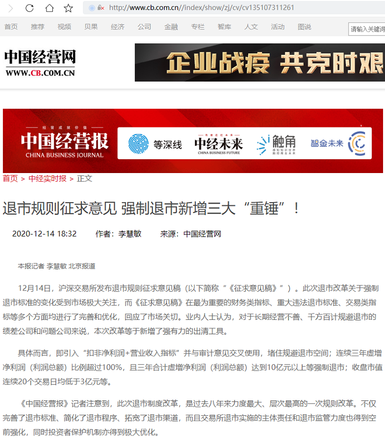 《中国经营报》记者注意到,此次退市制度改革,是过去八年来力度最大、层次最高的一次规则改革。不仅完善了退市标准、简化了退市程序、拓宽了退市渠道,而且交易所退市实施的主体责任和退市监管力度也得到空前强化,同时投资者保护机制亦得到极大优化。