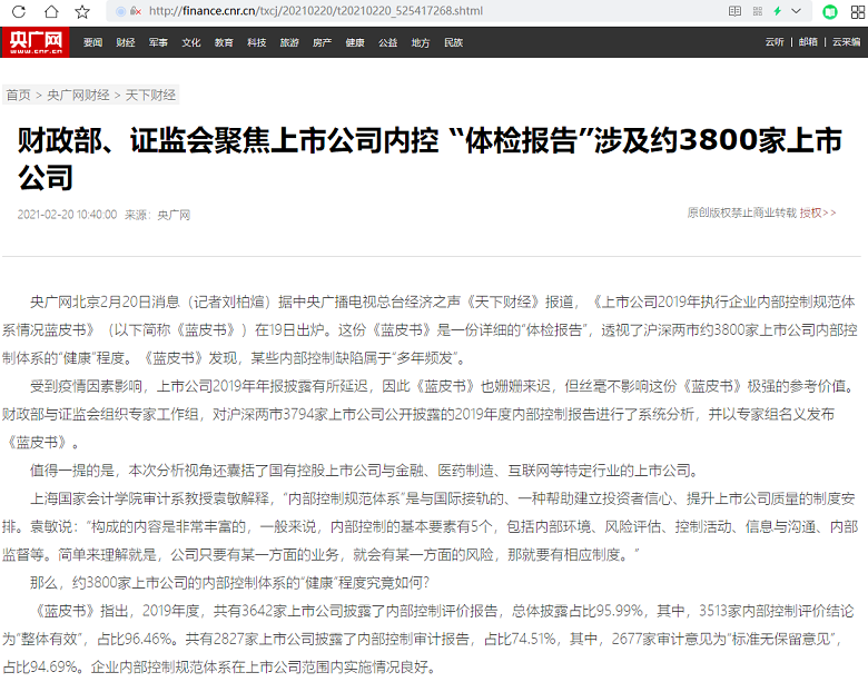 央广网北京2月20日消息(记者刘柏煊)据中央广播电视总台经济之声《天下财经》报道,《上市公司2019年执行企业内部控制规范体系情况蓝皮书》(以下简称《蓝皮书》)在19日出炉。这份《蓝皮书》是一份详细的“体检报告”,透视了沪深两市约3800家上市公司内部控制体系的“健康”程度。《蓝皮书》发现,某些内部控制缺陷属于“多年频发”。