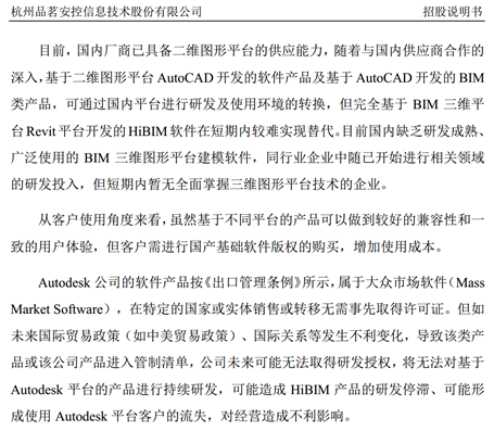 上海国家会计学院大数据与会计发展研究中心主任 刘凤委称,品茗用到的这个BIM的虚拟映射的、虚拟建造的这种软件,实际上它的底层的技术都是在美国。中国在这个行业里边其实都是在人家的平台基础上开发,主要是属于应用开发,我们结合中国的制造业开发出或者有一些跟人家不一样的地方。如果人家不对你授权,不授权一下子就完了,这不确定性的风险是比较大的。还有个问题,第一企业还没长大,比如说技术的风险、市场的风险、财务的一些风险等。对它们这个行业重要的不是赚钱,而是怎么样让客户认识到它们的价值,不断的抢占市场规模。