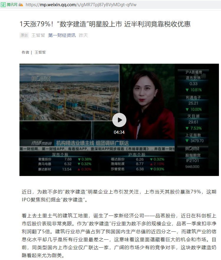 刘凤委:1天涨79%!“数字建造”明星股上市 近半利润竟靠税收优惠【2021年4月6日,第一财经资讯】