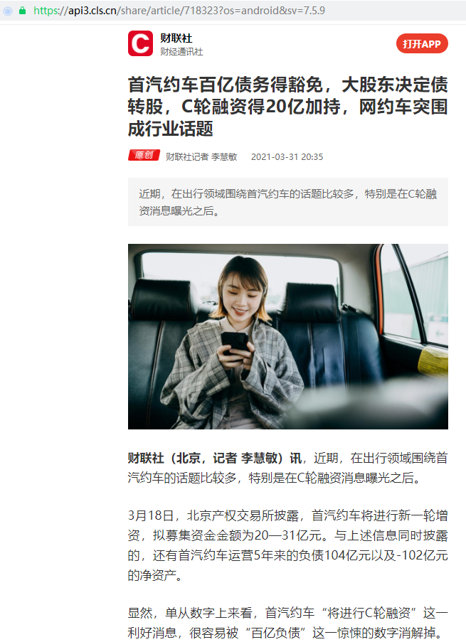 叶小杰:首汽约车百亿债务得豁免,大股东决定债转股,C轮融资得20亿加持,网约车突围成行业话题【2021年3月31日,财联社】