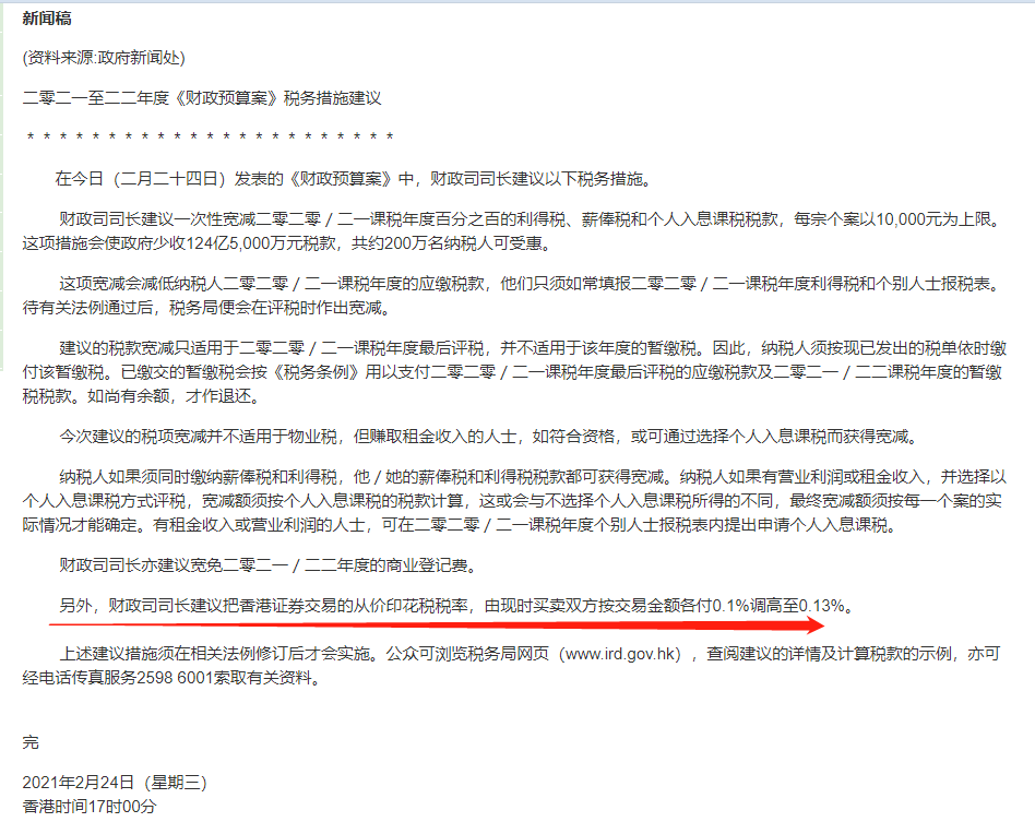 2月24日,香港特区政府财政司司长陈茂波表示,充分考虑对证券市场和国际竞争力的影响后,决定提交法案调整股票印花税税率,由现时买卖双方按交易金额各付0.1%,提高至0.13%。待相关立法程序完成后,措施将于修订条例订明的日期开始生效。