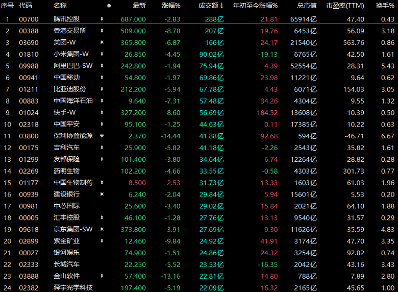 港交所官网显示,今日港股主板成交金额为3530亿港元。成交额前五的个股分别是腾讯控股、香港交易所、美团、小米集团、阿里巴巴,均处于下跌状态。个股跌多涨少,2194只港交所主板个股中有1447只下跌。
