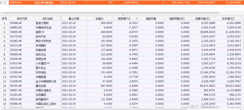 恒生指数权重股大跌,52只恒指成份股中有41只收跌,香港交易所以8.78%的跌幅居前,中国海洋石油、美团跌幅约7%。