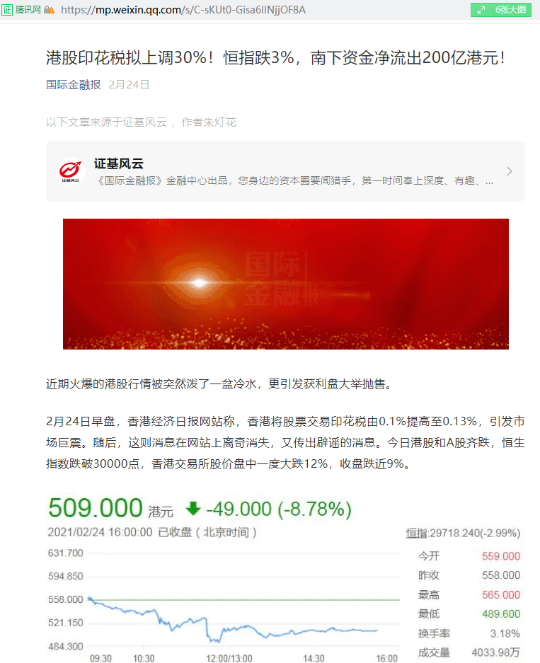 叶小杰:港股印花税拟上调30%!恒指跌3%,南下资金净流出200亿港元!【2021年2月24日,国际金融报】