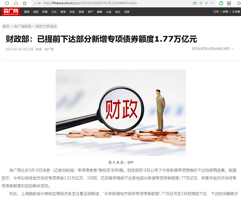 葛玉御:财政部:已提前下达部分新增专项债券额度1.77万亿元【2021年3月18日,央广网】