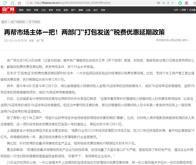 葛玉御:再帮市场主体一把!两部门“打包发送”税费优惠延期政策【2021年3月24日,央广网】