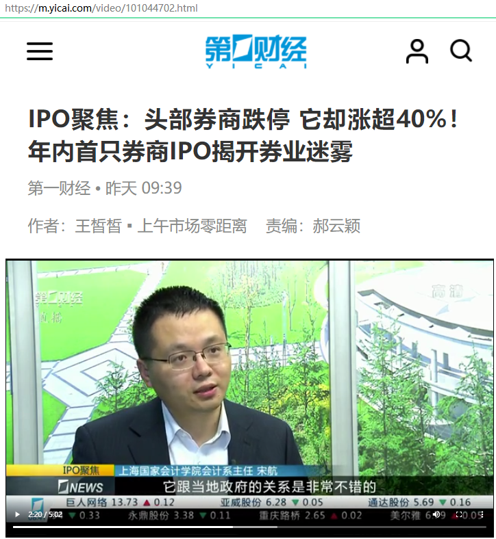 宋航:IPO聚焦:头部券商跌停 它却涨超40%!年内首只券商IPO揭开券业迷雾【2021年5月10日,第一财经电视台】