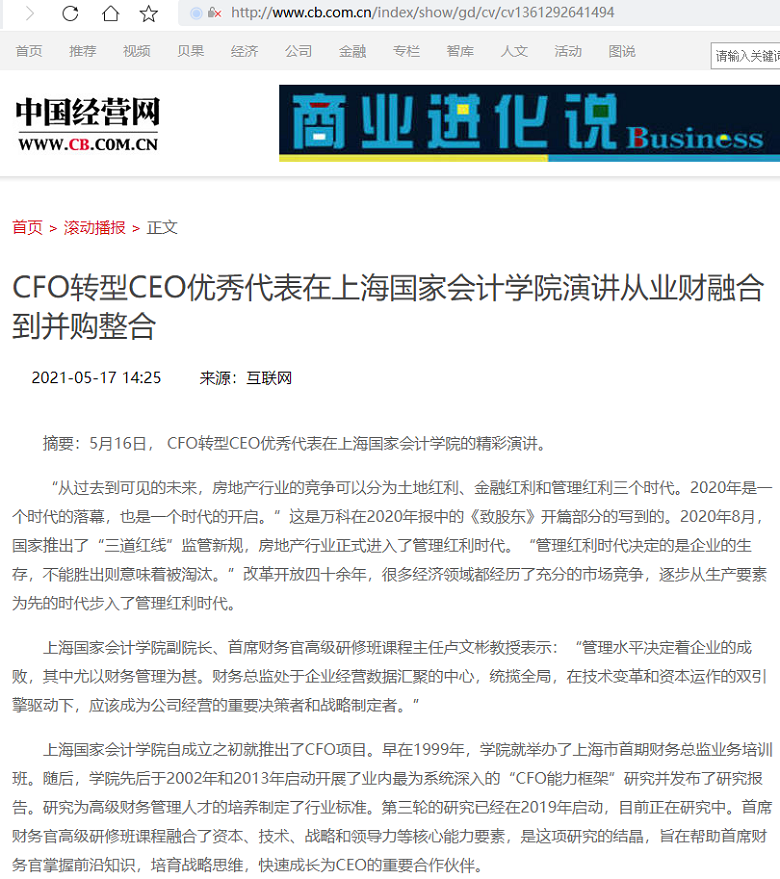 CFO转型CEO优秀代表在上海国家会计学院演讲从业财融合到并购整合【2021年5月17日,中国经营报】