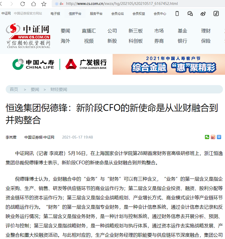 恒逸集团倪德锋:新阶段CFO的新使命是从业财融合到并购整合【2021年5月17日,中国经营报】
