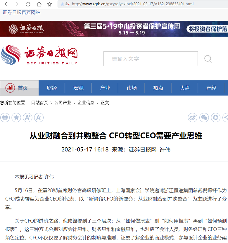 从业财融合到并购整合 CFO转型CEO需要产业思维【2021年5月17日,证券日报】