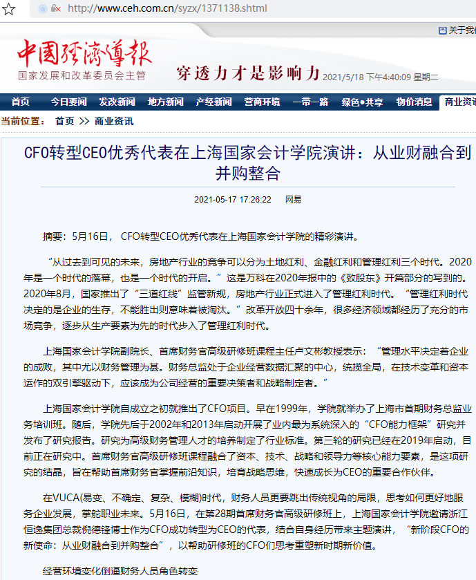 CFO转型CEO优秀代表在上海国家会计学院演讲:从业财融合到并购整合【2021年5月17日,中国经济导报】
