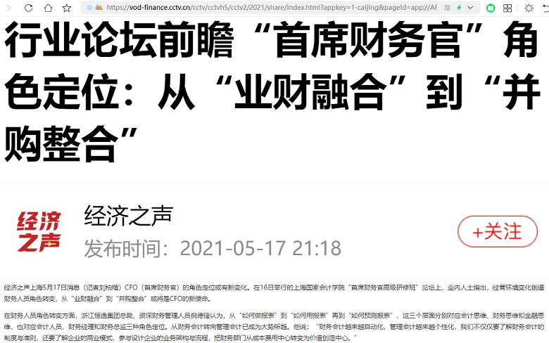 行业论坛前瞻“首席财务官”角色定位:从“业财融合”到“并购整合”【2021年5月17日,央视财经】