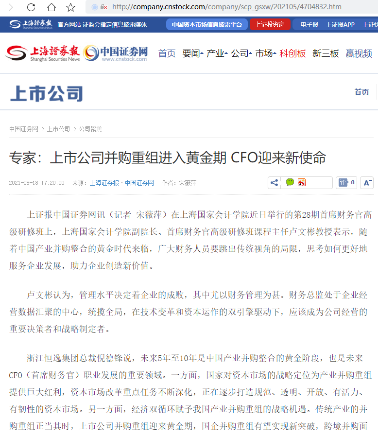 专家:上市公司并购重组进入黄金期 CFO迎来新使命【2021年5月18日,上海证券报】