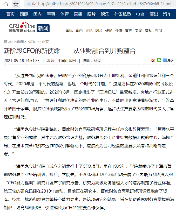 新阶段CFO的新使命——从业财融合到并购整合【2021年5月18日,国际在线】