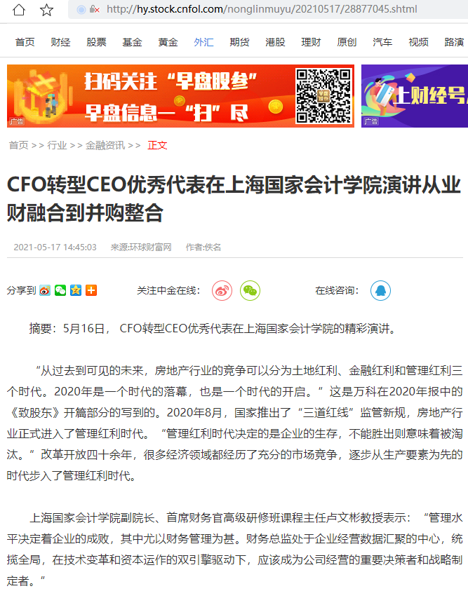 CFO转型CEO优秀代表在上海国家会计学院演讲从业财融合到并购整合【2021年5月17日,中金在线】