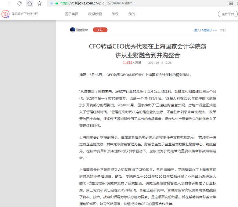 CFO转型CEO优秀代表在上海国家会计学院演讲从业财融合到并购整合【2021年5月17日,同花顺】