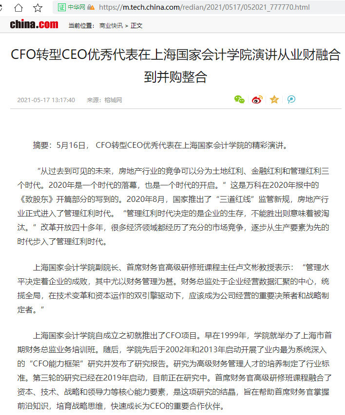 CFO转型CEO优秀代表在上海国家会计学院演讲从业财融合到并购整合【2021年5月17日,中华网】