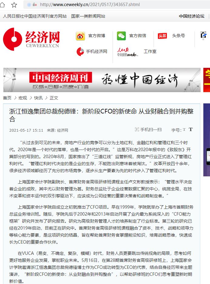 浙江恒逸集团总裁倪德锋:新阶段CFO的新使命 从业财融合到并购整合【2021年5月17日,人民日报-经济网】